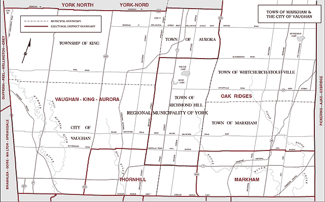 In this model, the four existing ridings of Markham, Oak Ridges, Thornhill and Vaughn-King-Aurora are combined into one riding, which we will call York. The new riding would elect four members of parliament. |